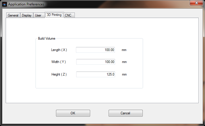 In order to take advantage of some features of Afanche3D for 3D printing, you need to set up your 3D printer system first. Go to "Tools" menu, click "Options", in "3D Printing" tab of the popped up dialog, type in the length, width and height of the build volume of your 3D printer. It looks like the following screenshot: