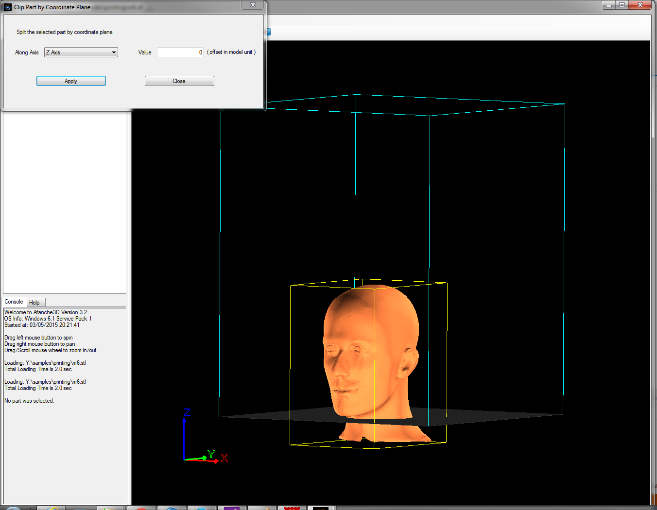 In order to fix the problem, we can cut the bottom part off. Select the 3D part first by clicking the 3D part, then go to "Model" menu, click "Clipping", click "Coordinate Plane", you will see the following popup dialog: