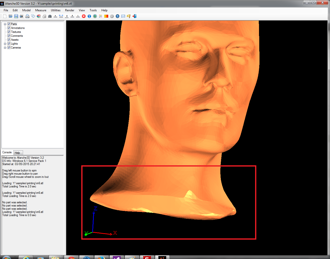 Sometimes, your 3D model can't be printed successfully because it has some problems. Very often, you can cut off the bad part of the 3D model and just print the good part. Afanche3D provides 3D model slicing feature which can be used for printing model fixing purpose. The following picture shows a 3D scanned model. Please note the bottom part of the model. It has gaps and uneven bottom boundary. If you send the model to 3D printer directly, very likely the 3D printer would fail.