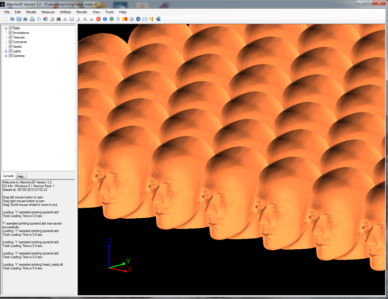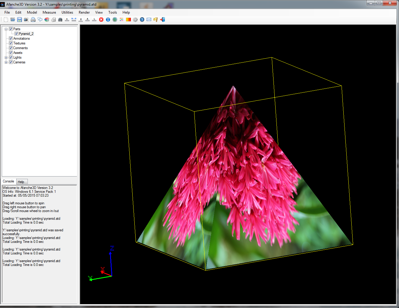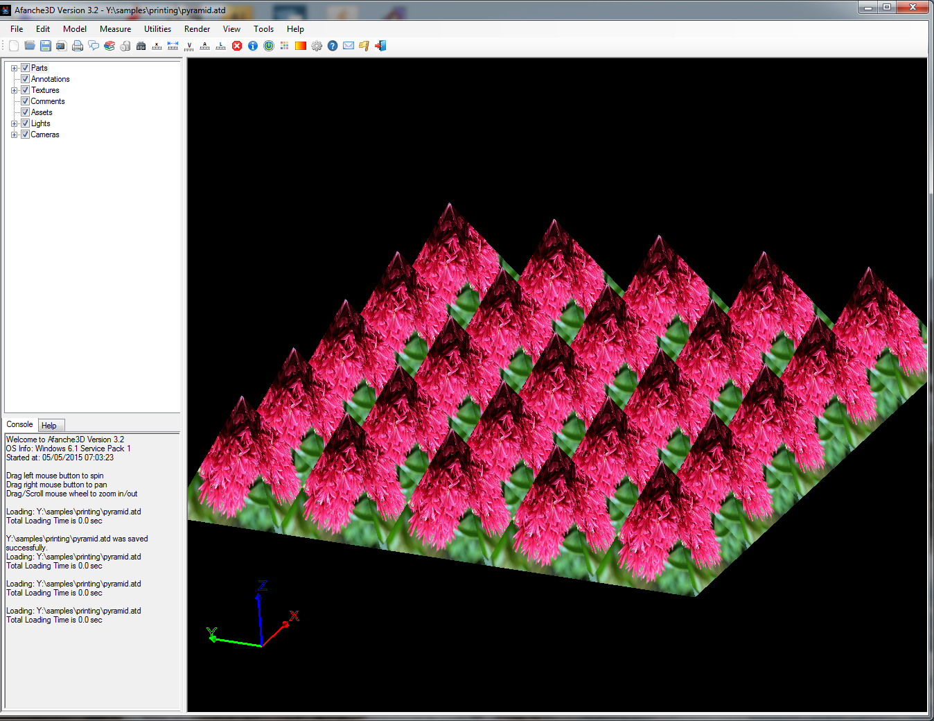 Afanche3D provides a great tool to duplicate 3D object by pattern. In order to do it, please select a 3D geometry first. The following picture shows a 3D pyramid model with texture mapping rendering: