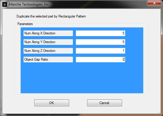 After the 3D object is selected, go to "Model" menu, click "Duplication", click "Rectangular Pattern", the following dialog will pop up: