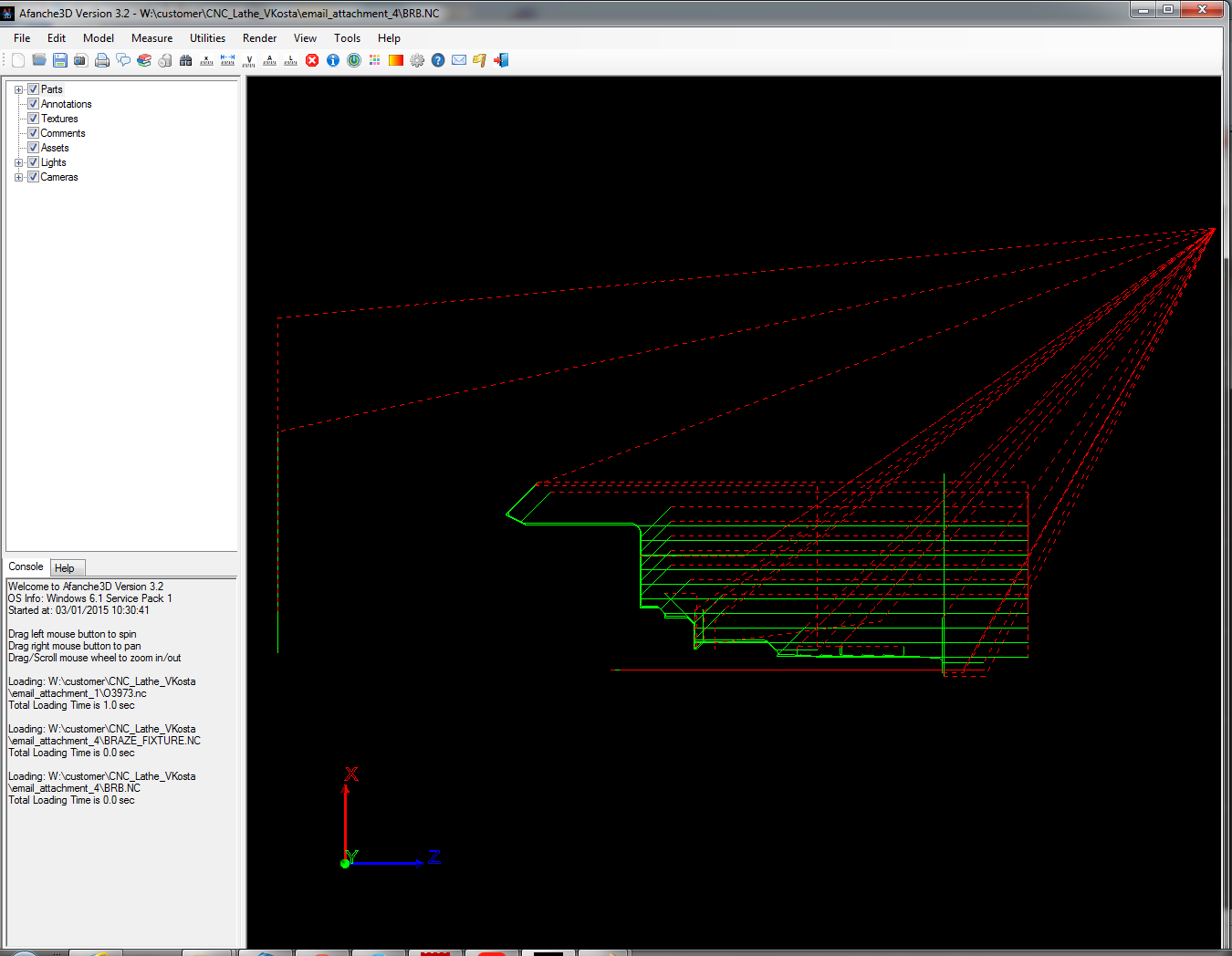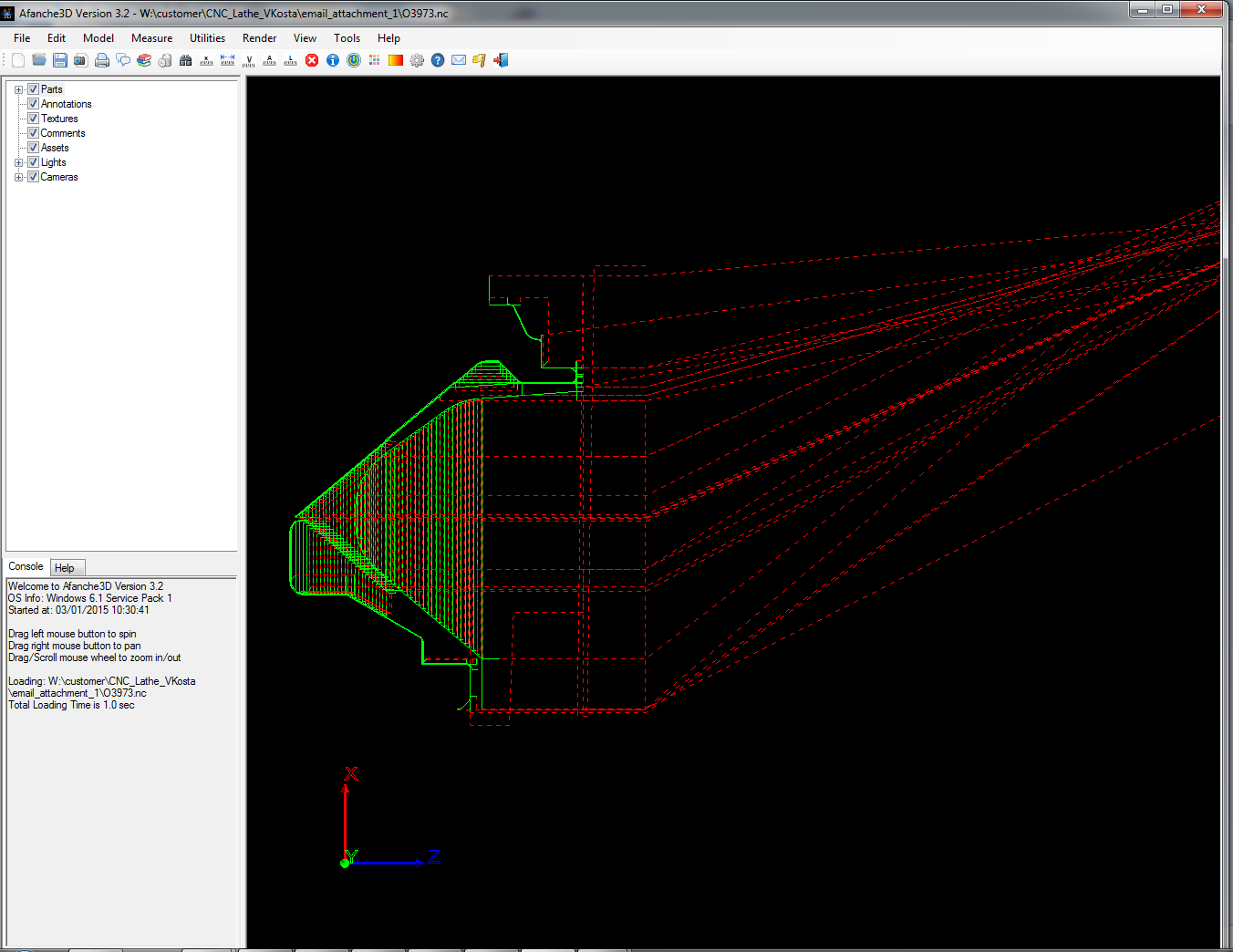 That's all you need to do in order to view Lathe G-Code. Afanche3D displays rapid moves (G0) in red color, cutting moves in green color. Here is a sample G-Code file: